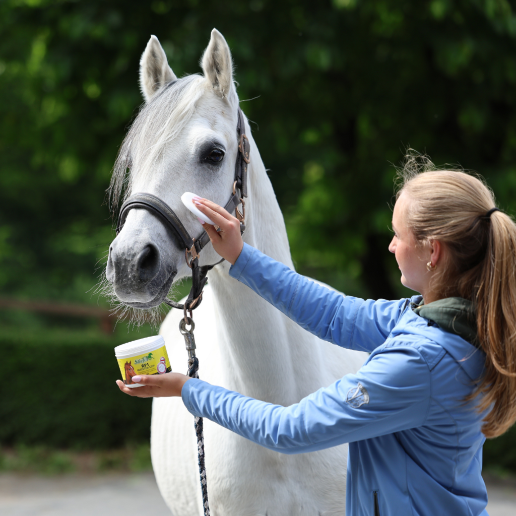 Hinweise: Biozidprodukte vorsichtig verwenden. Vor Gebrauch stets Etikett und Produktinformationen lesen. Behälter dicht verschlossen halten. Vor Kleinkindern gesichert aufbewahren. Nicht unter dem Sattel oder der Kleidung anwenden. Bei Verschlucken ärztlichen Rat einholen, Packung und Etikett vorlegen. Nur zur äußerlichen Anwendung. Kann allergische Reaktionen hervorrufen.