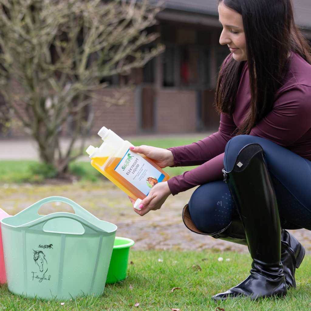 Stiefel Electrolyte – for rapid regeneration Stiefel Electrolyte is used to compensate for electrolyte losses in sports horses as well as for the stabilisation of the water and electrolyte balance of foals and old horses. It contains sodium, potassium, calcium and magnesium. Electrolytes such as sodium and potassium are required to stabilise the pressure in the body cells. Large amounts of electrolytes are excreted during strong sweating at high temperatures and due to high performance or diarrhoea. The loss of electrolytes is proportional to the loss of sweat. On hot days, a horse weighing approx. 600 kg can lose up to 35 l of sweat in 5-7 hours. Electrolytes are responsible for regulating the water balance. An inadequate water balance leads to lack of energy and a drop in performance. The highly concentrated ingredients of Stiefel Electrolyte compensate for this deficit and contribute to faster regeneration. Stiefel Electrolyte is further enriched with magnesium to support the muscular metabolism. Any horse that needs to perform should be sufficiently supplied with electrolytes during the tournament season and when undergoing intensive training. Old horses may also experience high electrolyte losses at high temperatures. There are unfortunately no deposits for electrolytes in the body. Sufficient supply in the feed is therefore required in the event of high consumption. Recommendation: Sufficient roughage should be supplied when high performance is needed or at high temperatures. Crude fibre binds water inside the intestines and thus acts as a storage facility.