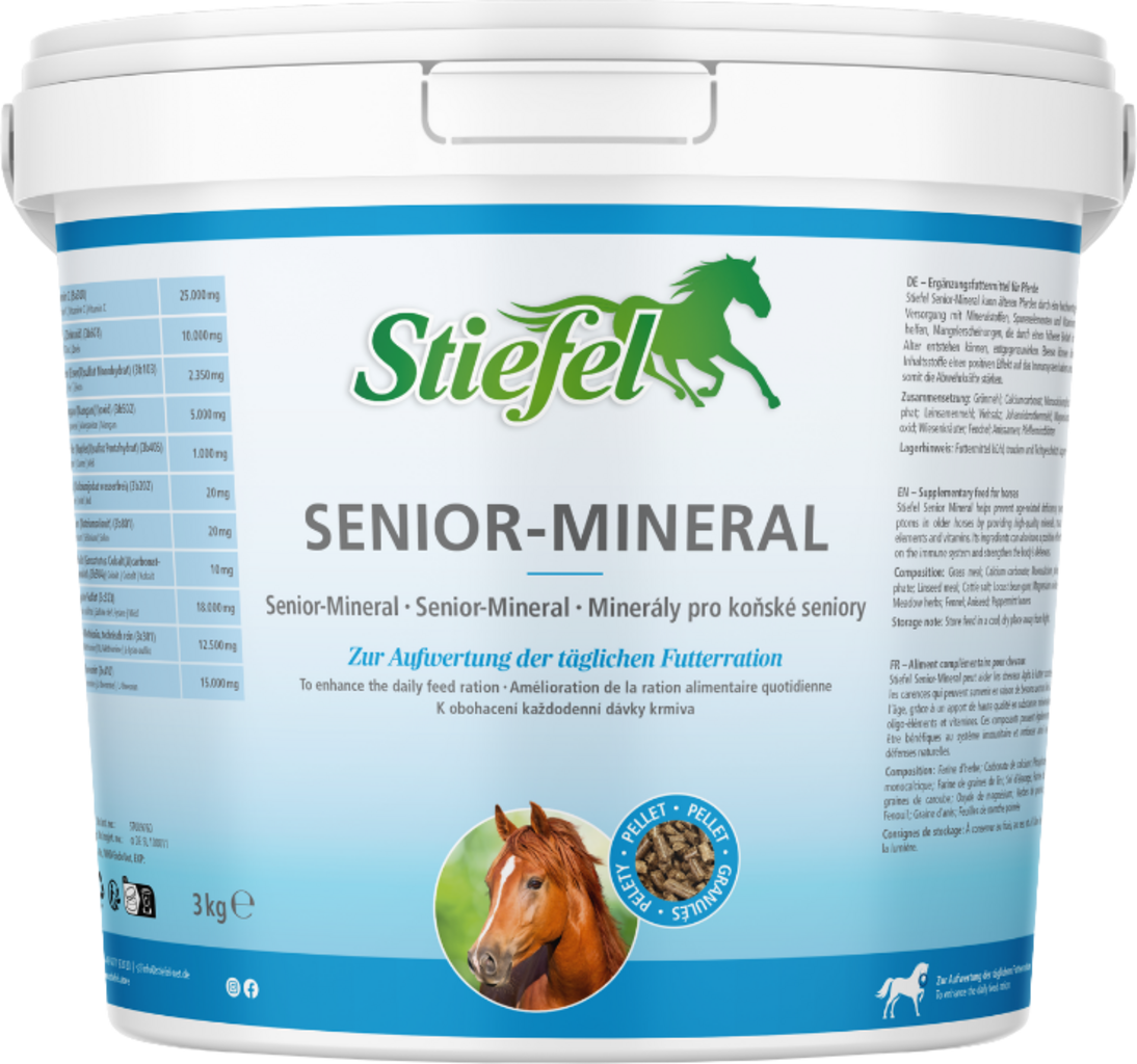 Stiefel Senior-Mineral can help counteract deficiency symptoms in older horses that arise as a result of higher nutrient requirements as they age. It is a high-quality source of minerals, trace elements and vitamins. These nutrients also have a positive effect on the immune system and thus strengthen the horse's immunity.
