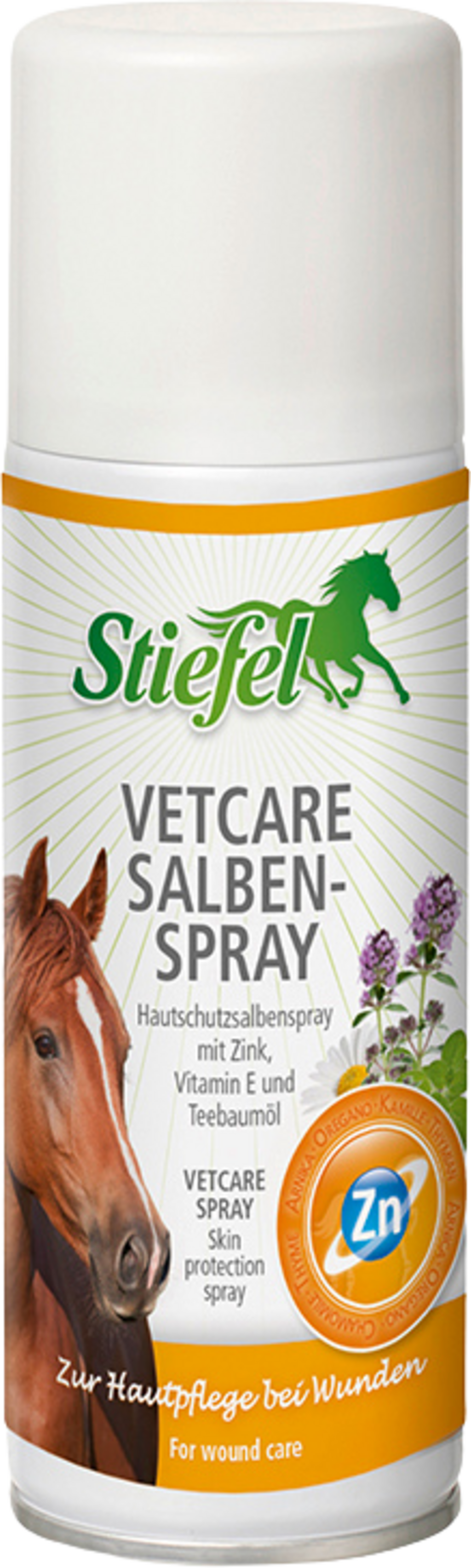 Stiefel Vetcare Spray Salve is a spray-on salve for first-aid care of skin wounds. The selected herbal ingredients (arnica, oregano, thyme, camomile and tea tree oil) in combination with zinc and vitamin E can improve the wound healing process. Stiefel Vetcare Spray Salve can soothe and care for wounded skin. It has an anti-inflammatory and supportive effect in the treatment of mud fever and chafing. It also helps alleviate feelings of tightness, itching and chafing.