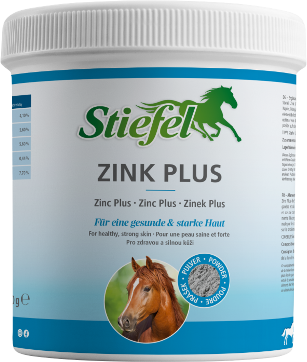 Zinc Plus est à utiliser en complément de la ration quotidienne, pour compenser les carences nutritionnelles en zinc et en oligo-éléments. Contient du zinc, du fer, du cuivre, du manganèse et du sélénium liés organiquement. Les oligo-éléments peuvent être utilisés de manière optimale par le corps sous une forme organiquement liée. Zinc Plus peut avoir un effet positif sur le système immunitaire, la peau et la corne. Le zinc est généralement l'un des oligo-éléments essentiels pour le métabolisme et est un composant de nombreuses enzymes. Il est également impliqué dans la croissance cellulaire et la cicatrisation des plaies, en particulier dans les problèmes de peau. Le système immunitaire et de nombreuses hormones ont besoin de zinc pour fonctionner. À chaque période de mue, la consommation en zinc augmente dans le corps du cheval. Le zinc ne peut être stocké dans le corps que dans une mesure limitée et doit donc être absorbé régulièrement par l'alimentation. Étant donné que de nombreuses régions ont un sol pauvre en zinc et en sélénium, les fourrages n'en contiennent pas non plus beaucoup, c'est pourquoi un apport extérieur en zinc en quantité suffisante est important dans de tels cas. Le cuivre est impliqué dans le transport de l'oxygène et, comme le manganèse et le sélénium, c'est un composant de nombreuses enzymes. Le manganèse joue également un rôle important dans l'utilisation de la vitamine B1. Le sélénium joue un rôle important dans la protection des membranes cellulaires contre la destruction oxydative. Le fer est principalement responsable de la formation de sang. Il joue également un rôle important dans le transport et le stockage de l'oxygène ainsi que dans le métabolisme cellulaire.