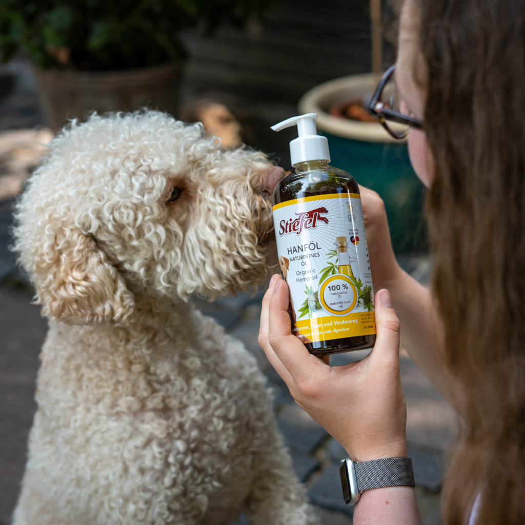 L'olio di canapa di Stiefel è un prodotto 100% naturale e adatto ai cani in tutte le fasi della vita. Gli ingredienti possono supportare la pelle e il pelo del cane e rafforzare le difese dell'animale.