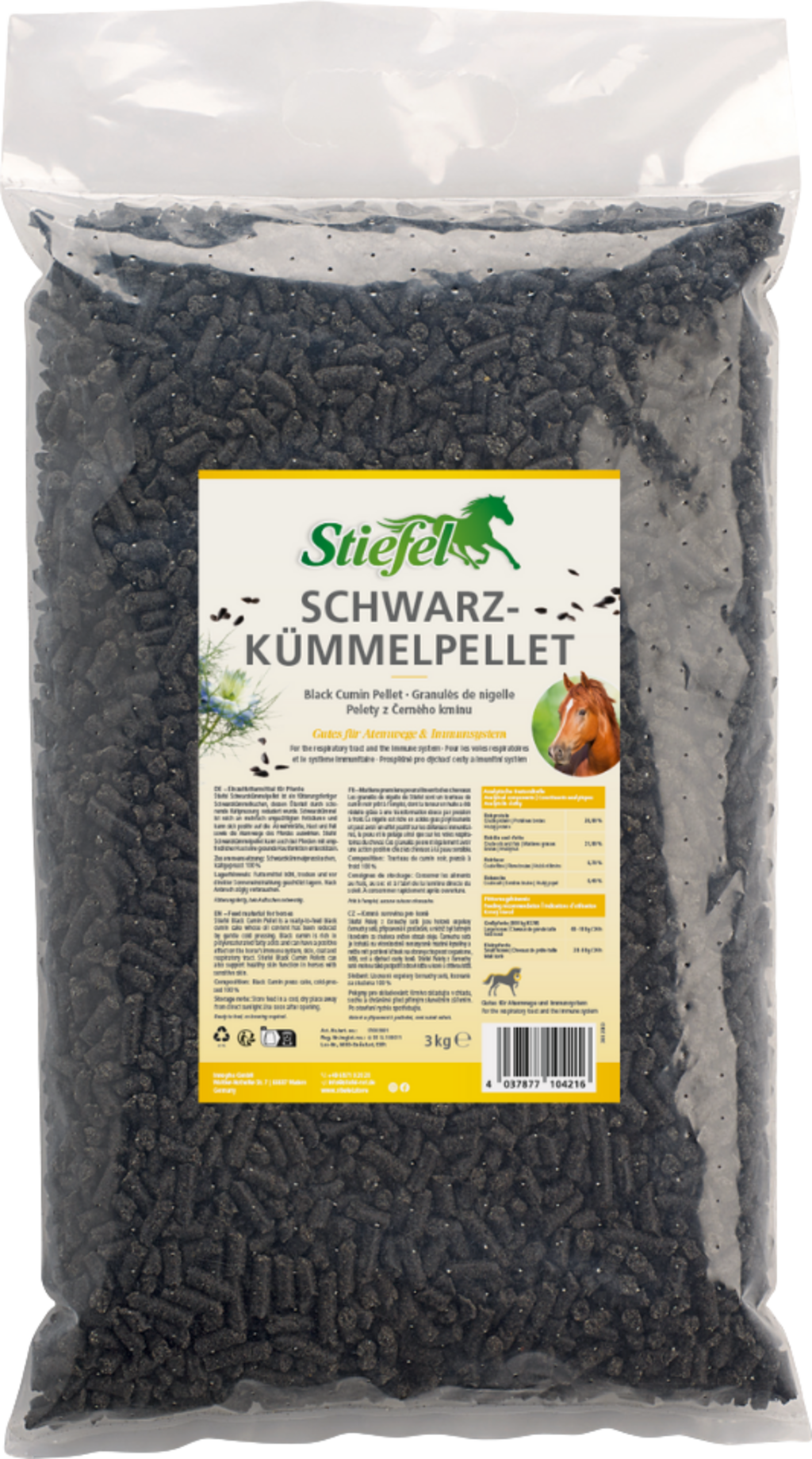 I Pellet di Cumino Nero di Stiefel sono pronti all'uso, il cui contenuto di olio è stato ridotto attraverso una delicata spremitura a freddo. Il cumino nero è ricco di acidi grassi polinsaturi e può avere un effetto positivo sull'organismo, sul sistema immunitario, sulla pelle, sul pelo e sul sistema respiratorio del cavallo. Inoltre, può anche essere utile anche per i destrieri con la pelle sensibile dato che supporta la funzione cutanea.
