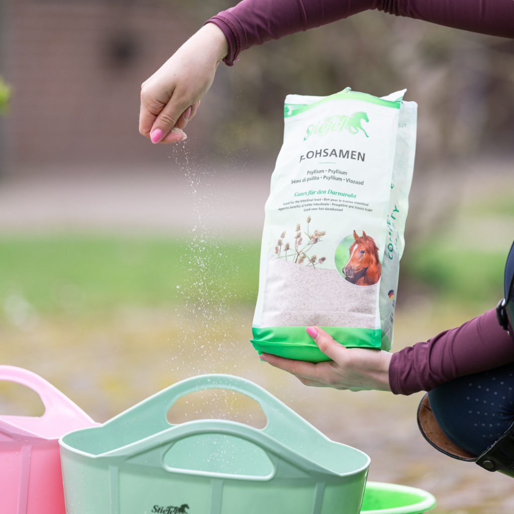 NOTA: le bucce di psillio devono essere sempre completamente bagnate con abbastanza acqua, altrimenti possono verificarsi coliche di stitichezza. Inoltre, il cavallo dovrebbe sempre avere accesso illimitato all'acqua.