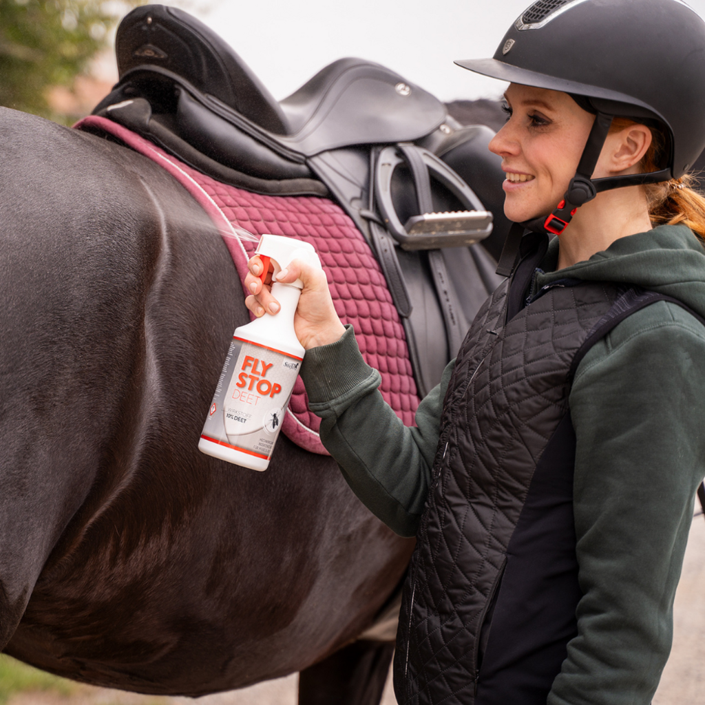 Stiefel FlyStop DEET je novo aktivno sredstvo za odganjanje insektov v skladu s predpisi o biocidih. Aktivna sestavina DEET®, ki jo priporoča Svetovna zdravstvena organizacija, je repelent, ki lahko odvrača žuželke. Stiefel FlyStop DEET zagotavlja dolgotrajno zaščito pred nadležnimi obadi, jelenovimi muhami in muhami ter je primeren za konja in jahača. Za optimalno učinkovitost je treba Stiefel FlyStop DEET razpršiti po celotnem telesu konja. Zaradi hlapnih lastnosti aktivne sestavine se ustvari tanek zaščitni oblak vonja, ki lahko traja več ur.