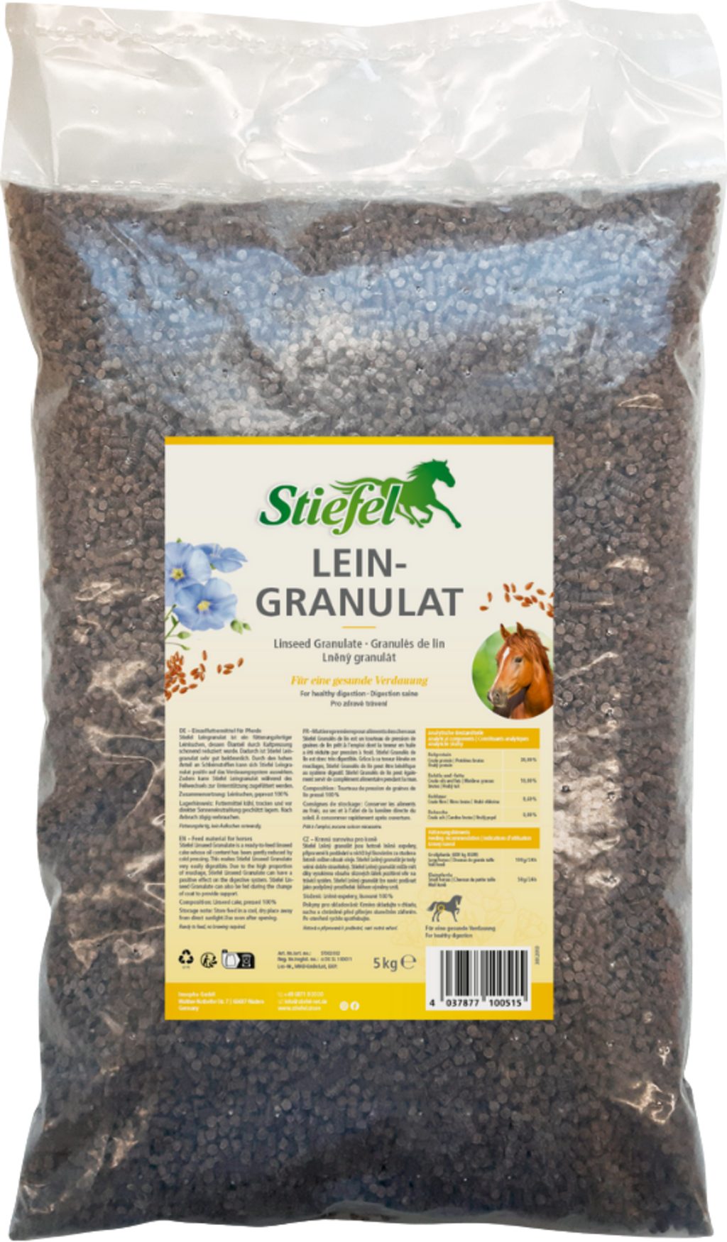 Stiefel laneni granulat je pripravljena lanena pogača, katere vsebnost olja je bila nežno zmanjšana s hladnim stiskanjem. To pomeni, da je granulat lanenega semena zelo prebavljiv. Zaradi visokega deleža sluzi lahko laneni granulat ugodno vpliva na prebavni sistem. Granulat se lahko ponudi tudi pri menjavi dlake, da zagotovi podporo.