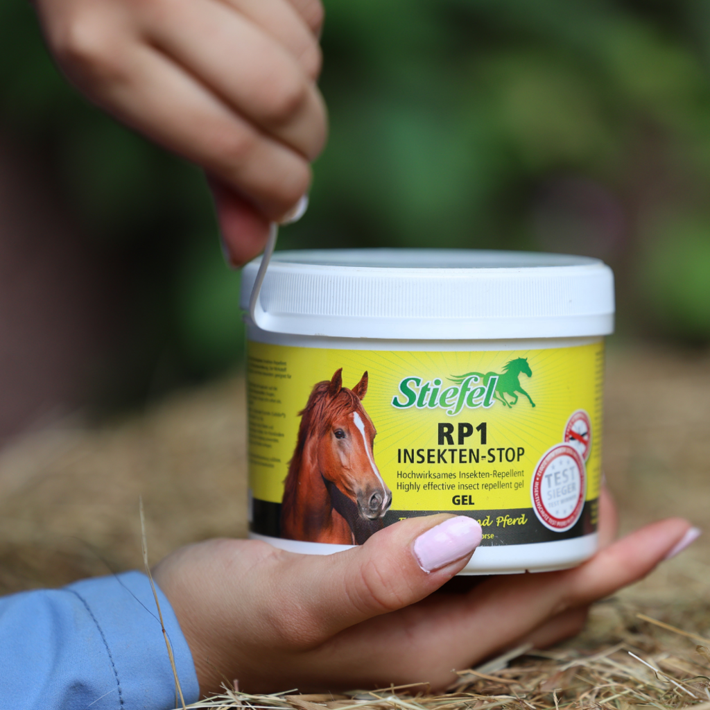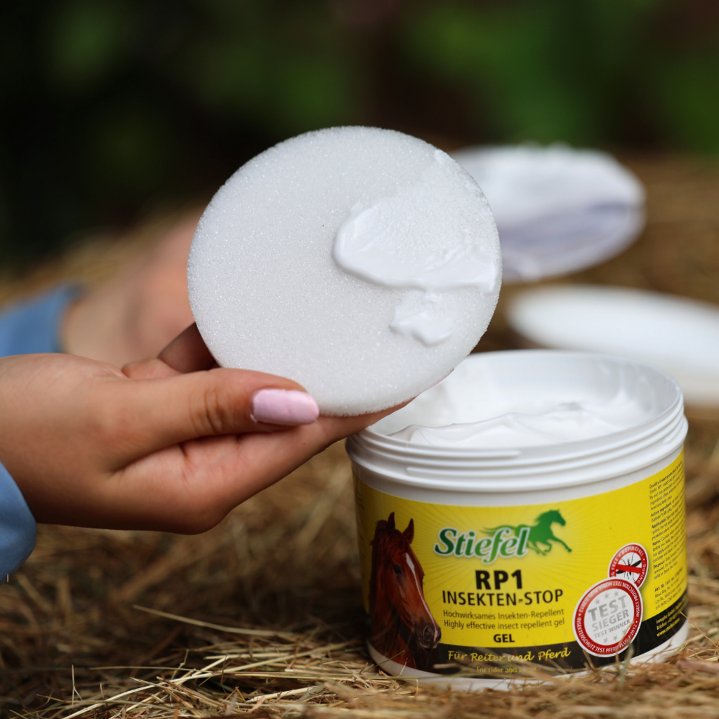 Stiefel RP1 Gel proti insektom je zelo učinkovit repelent z aktivno zaščito pred klopi in žuželkami v skladu s predpisi o biocidih v obliki gela. Stiefel RP1 Gel proti insektom je še posebej primeren za občutljiva območja in konje, ki so občutljivi na škropljenje, saj se gel na konja nanaša s priloženo gobo. Poleg tega Stiefel RP1 Gel proti insektom deluje brez alkohola, zato se lahko uporablja tudi pri konjih z ekcemom.