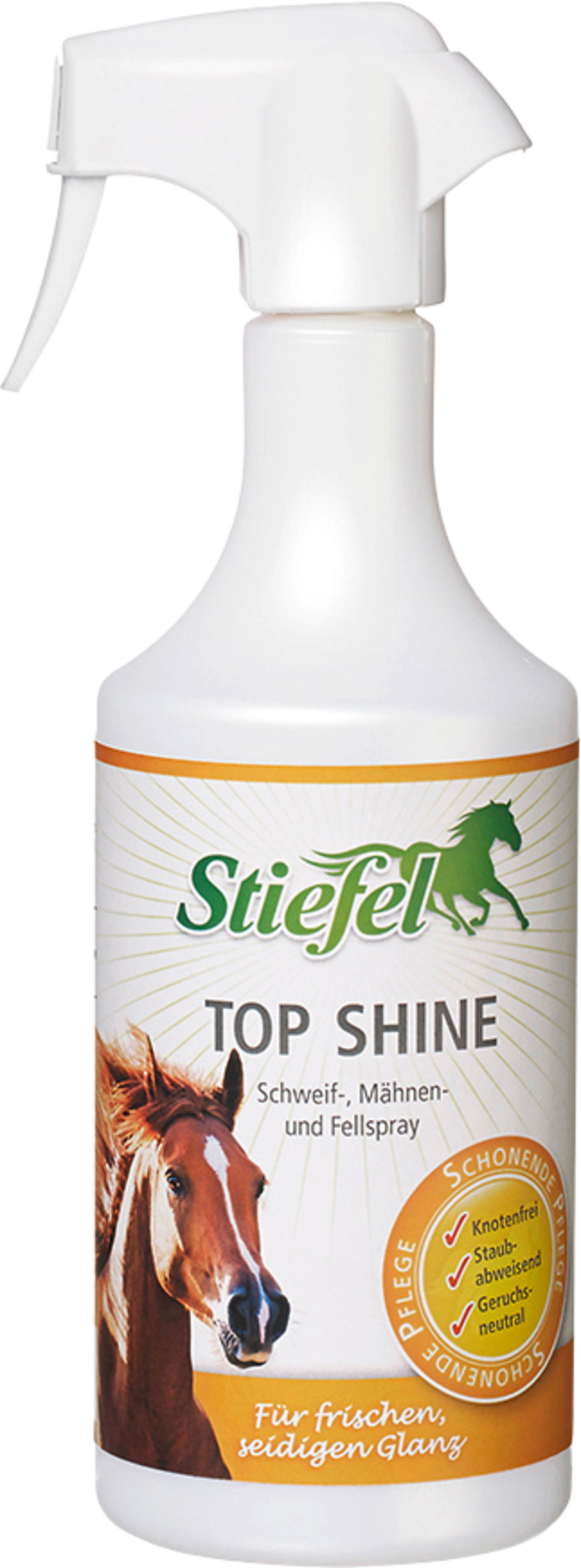 Stiefel Top Shine - kakovostna nega za plašč, grivo in rep. Za lažje krtačenje brez vozlov. Za nežno nego dlake, ki po uporabi postane svilnato sijoča. Nevidna zaščitna folija, ki obda dlako in kožuh, ima prašno odbijajoč učinek in ščiti pred vozli.