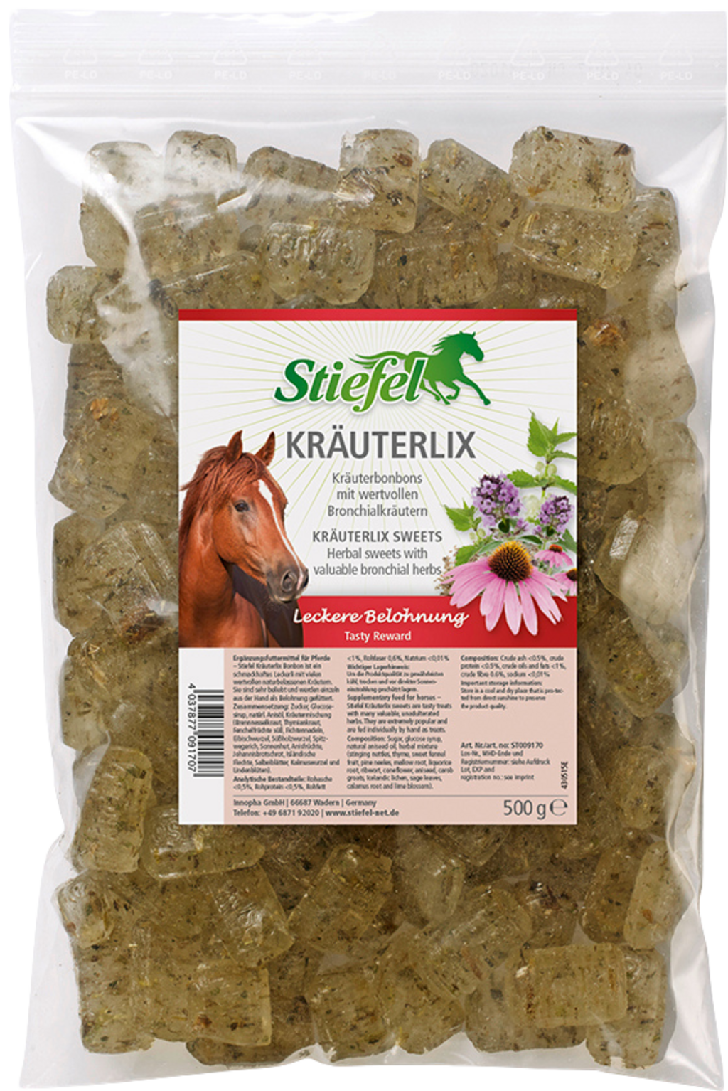 Stiefel zeliščni bonboni so okusna poslastica s številnimi dragocenimi naravnimi zelišči. Bonboni so zelo priljubljeni in jih kot nagrado lahko ponudite kar iz roke.